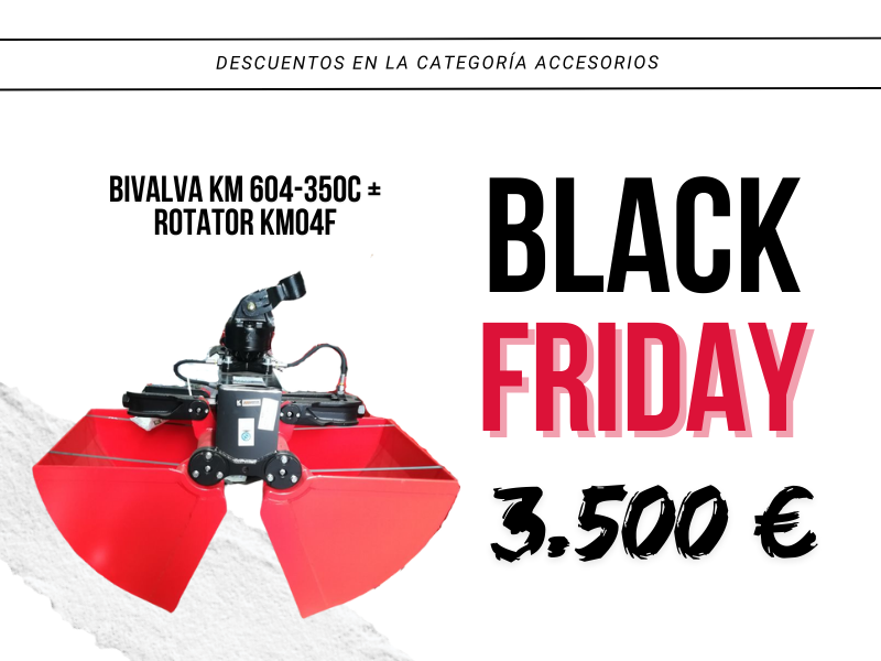 Clamshell bucket for crane, model KM 604-350C. This clamshell bucket is compact and light, for handling different materials, suitable for industrial vehicles with knuckleboom crane. It includes a rotator and is ready for immediate delivery. For more information, please fill the form below or call tl. (+34) 938498388