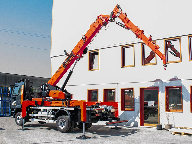 This machine, which is making its global market debut at SMOPYC, represents a significant leap forward within the TRX family. With a maximum lifting capacity of 8 tons, a reach exceeding 27 meters, and a working footprint of up to 4.6 x 4.6 m, the TRX80 is positioned as a high-performance urban lifting solution. Furthermore, it operates entirely on a lithium battery and features a generator connected to the truck's power take-off (PTO), as well as single-phase and three-phase chargers, guaranteeing autonomy and versatility in any work environment.