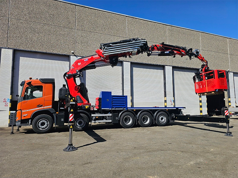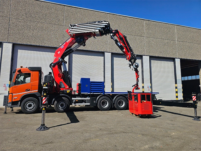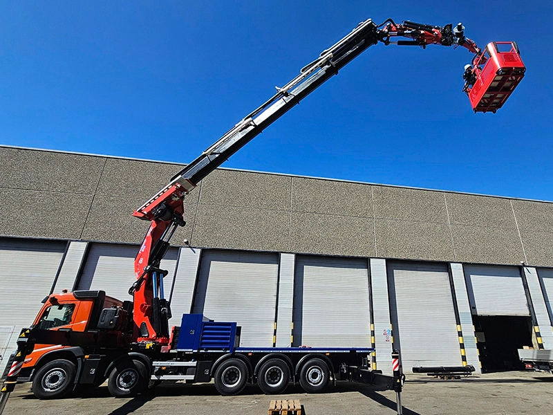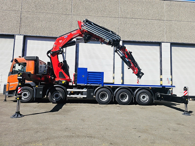 The delivered Fassi knuckle boom crane stands out for its impressive lifting capacity of 132 tn/m and its HD5/SII classification, designed for the most demanding jobs. Its configuration includes 8 hydraulic extensions plus 3 manual ones, an L826 jib with 3 additional manual extensions, and continuous 360° rotation with dual hydraulic motors. The outriggers, extendable up to 10 meters with 180° rotation and ball-joint support plates, along with the 8.50-meter rear outriggers, guarantee exceptional stability in any working configuration.