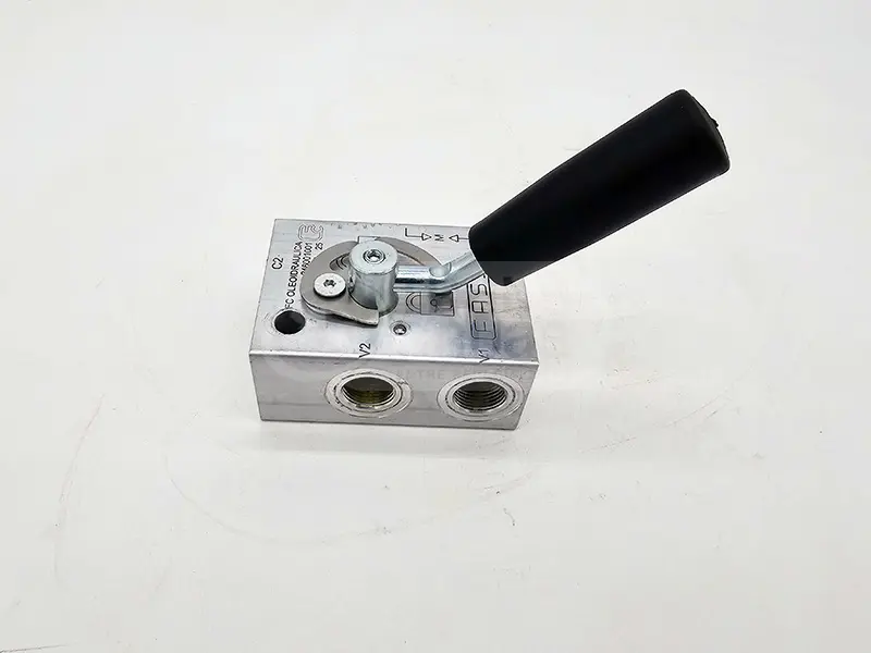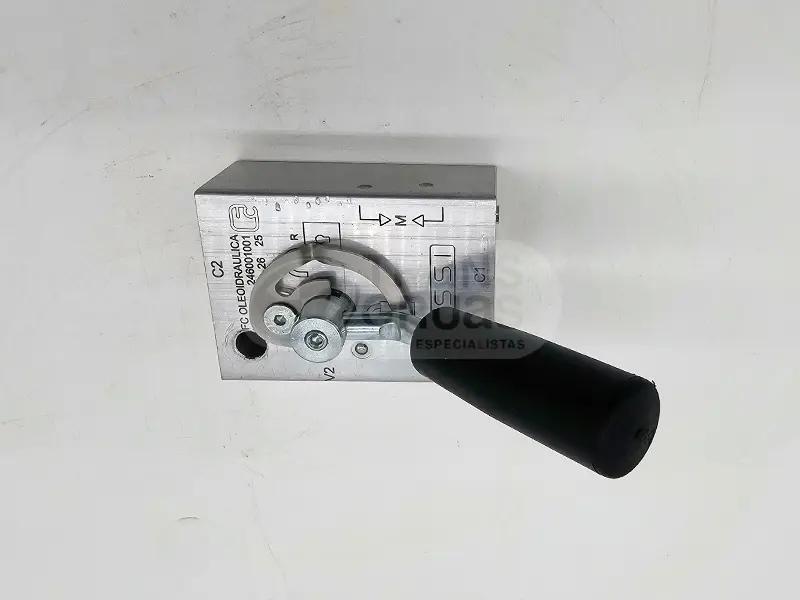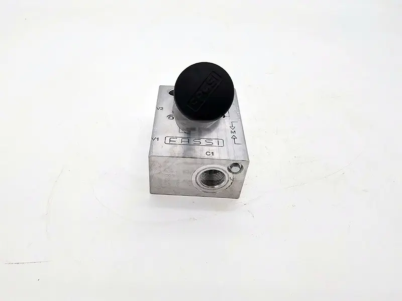 Locking valve for rotating stabilizers for Fassi cranes. The valve's function is to regulate and protect the hydraulic circuit by limiting oil flow pressure, preventing overloads and ensuring a constant oil flow. Many types of valves are available for different crane components.