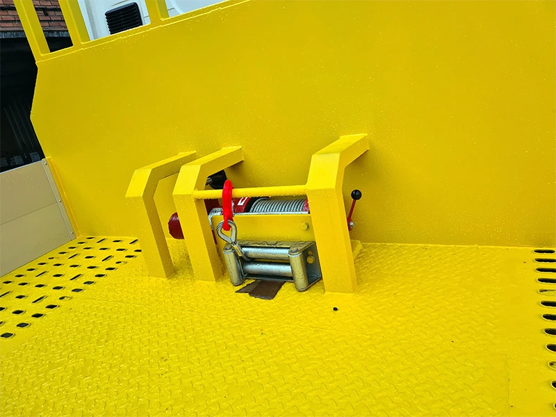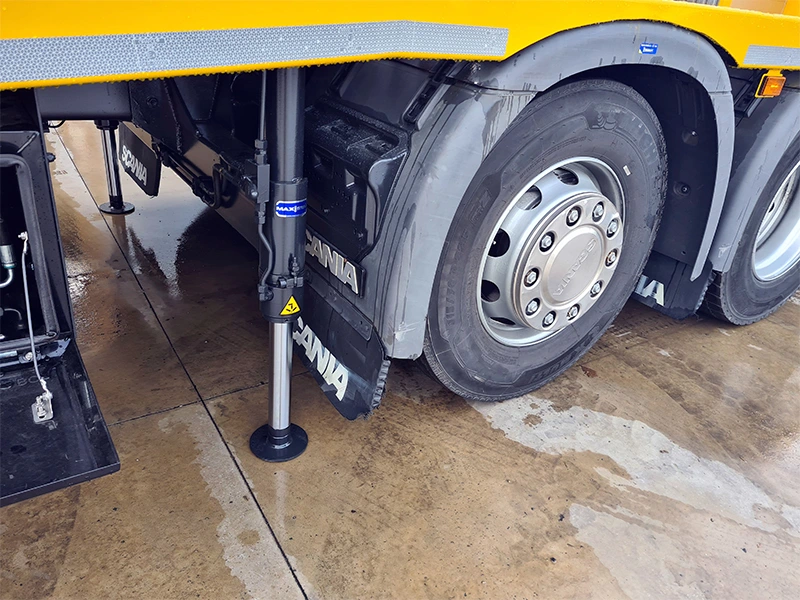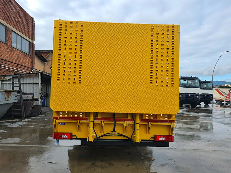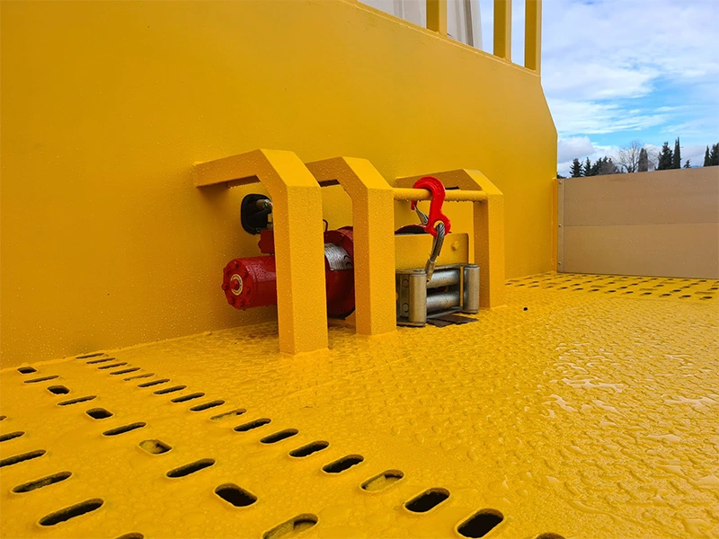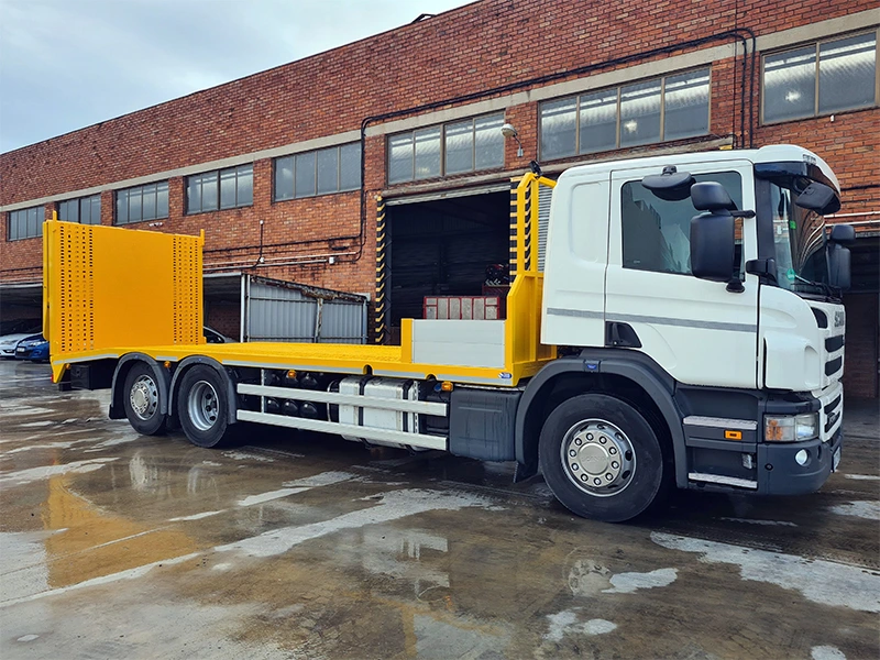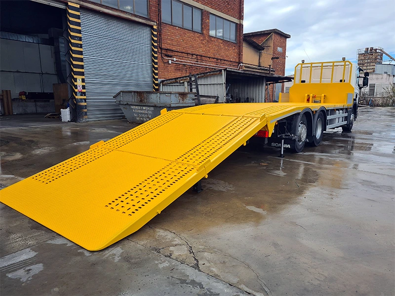 Uno de los elementos más destacados es su rampa trasera plegable reforzada, fabricada en chapa antideslizante y accionada mediante dos cilindros hidráulicos. Con una capacidad de carga de 15 toneladas y una inclinación aproximada de 10º–12º, garantiza un acceso seguro y fluido para todo tipo de maquinaria. La carrocería ha sido sometida a un proceso completo de granallado, dos capas de imprimación antioxidante y acabado final en RAL 1028 amarillo, asegurando una protección óptima frente a la corrosión y ofreciendo la personalización hasta el último detalle para nuestro cliente.
