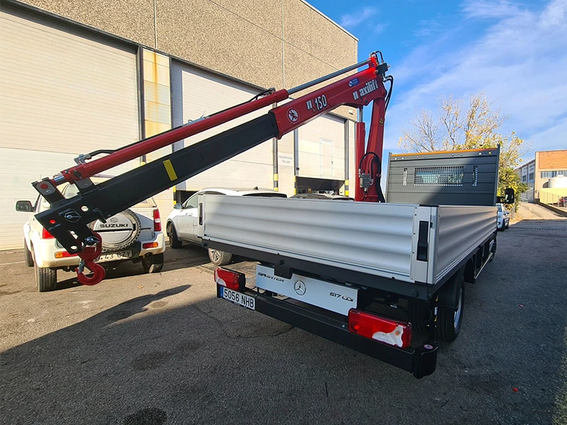 En términos de estabilidad y seguridad, la grúa incorpora una base con dos estabilizadores extensibles manuales con bajada hidráulica, aportando un apoyo firme durante las maniobras. Además, el montaje incluye kit de placa y tornillería de fijación, junto con un depósito de aceite de 15 litros con filtro, asegurando un funcionamiento hidráulico eficiente y una correcta conservación del sistema.